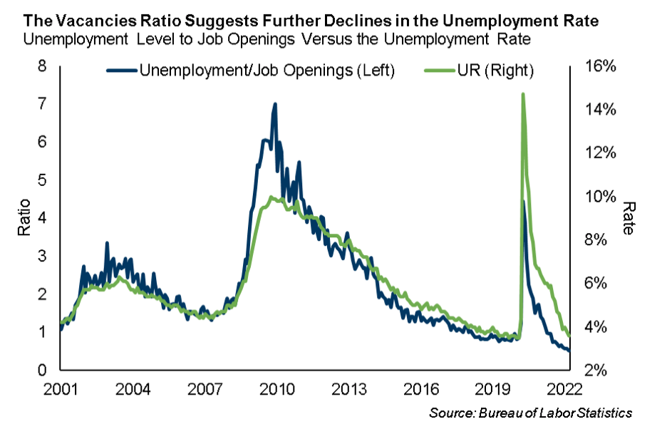 Ma l’andamento storico della domanda di lavoro suggerisce che il tasso di disoccupazione continuerà a diminuire nei prossimi mesi e non ad appiattirsi o a salire come pensano i politici (vedi grafico sotto). Se abbiamo ragione, la domanda continuerà a superare l’offerta, e la Fed potrebbe presto concludere che i tassi di politica monetaria dovranno muoversi “sopra la neutralità”, intorno al 3,5-4,0%. Per arrivare al 3,5-4,0% più velocemente, la Fed potrebbe continuare ad aumentare di 50 punti base ad ogni prossima riunione nel corso di quest’anno – raggiungendo un tasso finale più alto di quello che il mercato si aspetta attualmente.