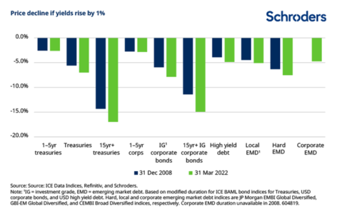 È importante notare che questa sensibilità ha un effetto in entrambi i sensi. Se i rendimenti dovessero calare, le obbligazioni a lungo termine sperimenterebbero un maggiore aumento di prezzo rispetto ad altre obbligazioni e a situazioni in passato.