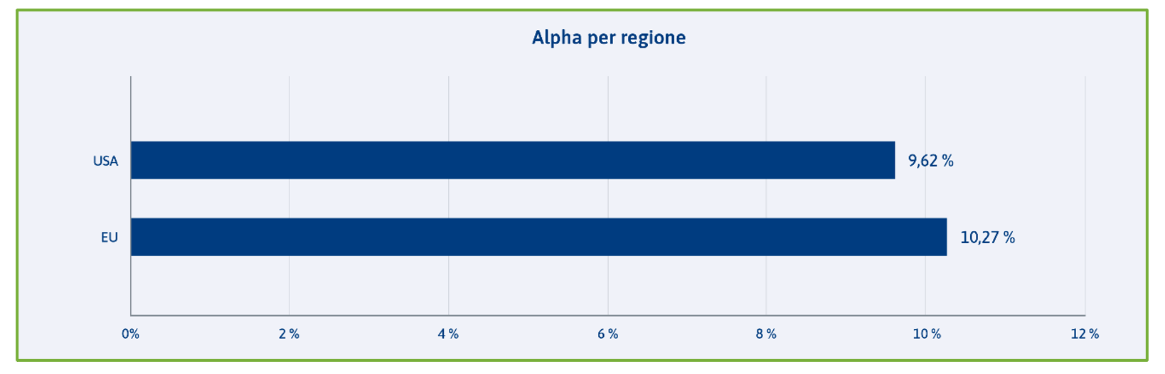 L’analisi a livello geografico mostra che non vi sono praticamente differenze di alpha per le transazioni in Europa rispetto a quelle negli Stati Uniti.