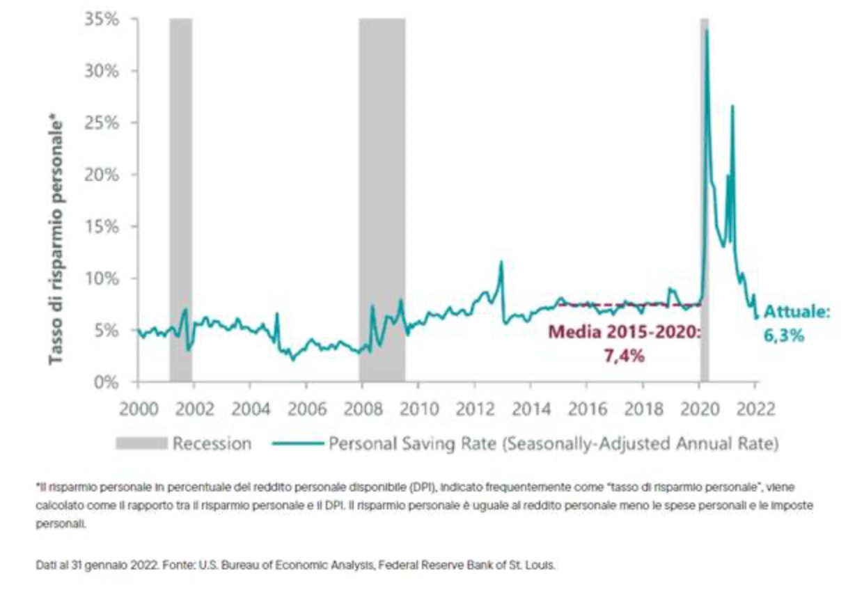 Inoltre le famiglie sono disposte a utilizzare la liquidità accumulata durante la pandemia per sostenere la spesa. Il tasso dei risparmi è sceso al 6,1% a gennaio, il livello più basso dal 2013. I risparmi accumulati saranno uno strumento chiave per assorbire lo shock e, con un tasso dei risparmi positivo, i consumatori in aggregato stanno ancora risparmiando anche a fronte di un aumento dell’inflazione (Figura 6). Date queste dinamiche, forse per la prima volta nella storia i consumatori stanno sperimentando una “mancanza irrazionale di esuberanza”, visto l’accumulo di disponibilità finanziaria e gli aumenti delle retribuzioni dell’era post-pandemia.