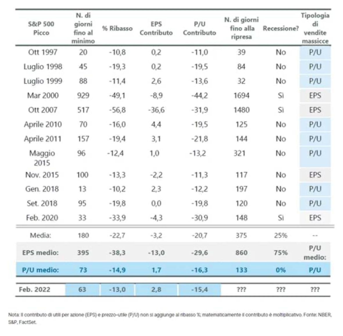 I drawdown più marcati e di durata più lunga si verificano abitualmente quando le attese di utili sono in calo, mentre le contrazioni degli utili trainate da vendite massicce tendono ad essere di durata più breve (Figura 7). Gli utili dell’indice S&P 500 sono stati ancora resilienti a fronte degli elementi geopolitici e macro negativi che si sono dovuti affrontare finora, aiutando a sostenere il mercato. In ultima analisi, la sostenibilità di questa dinamica dovrebbe dettare la durata e la portata del drawdown attuale, insieme ai tempi per una ripresa completa fino ai massimi precedenti.