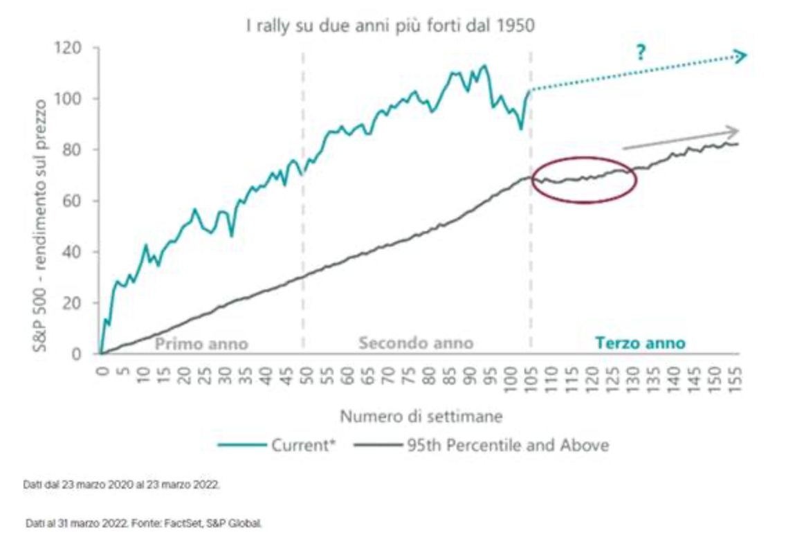 Lo scenario attuale è molto diverso dai cicli del passato e offre motivi di ottimismo riguardo alla resilienza dell’economia a fronte di molteplici shock. Sebbene il cuscinetto protettivo da altri shock sia minore, quello fornito da consumatori e aziende sani dovrebbe consentire a quest’espansione di durare ancora. Siamo ancora convinti che il 2022 sarà l’Anno della Transizione, come affermato nel blog The Long View del trimestre scorso, con la trasformazione della politica e del panorama degli utili che porta a un mercato azionario più volatile rispetto alle prime fasi della ripresa economica. Ciò ha cominciato ad essere visibile nel primo trimestre, amplificato dall’invasione dell’Ucraina da parte della Russia. La rapidità successiva della ripresa del mercato ha colto molti di sorpresa, tuttavia è coerente con la storia.