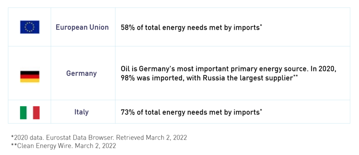 Nel 2020, l’Unione Europea ha importato il 58% del suo fabbisogno energetico dalla Russia, il suo maggiore fornitore esterno di petrolio, gas naturale e carbone. Il gas naturale è la fonte di energia principale per le famiglie europee ed è anche utilizzato nella produzione di energia e nell’industria. Il 90% di esso è importato e il 45% delle importazioni proviene dalla Russia. L’invasione russa dell’Ucraina ha fatto salire i prezzi del gas in Europa rispetto a quelli degli Stati Uniti e ha messo in evidenza la sua dipendenza dalle forniture estere, portando con sé numerose implicazioni e creando un’enorme pressione per un cambiamento. I leader europei ora capiscono chiaramente che non possono essere dipendenti da un unico fornitore per la fonte di energia che è la linfa vitale delle loro economie.