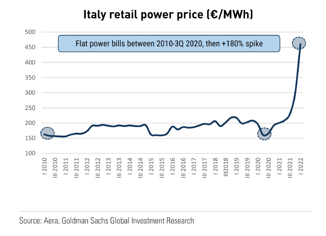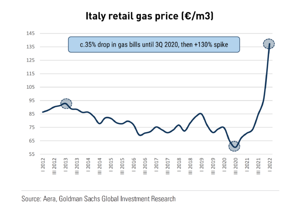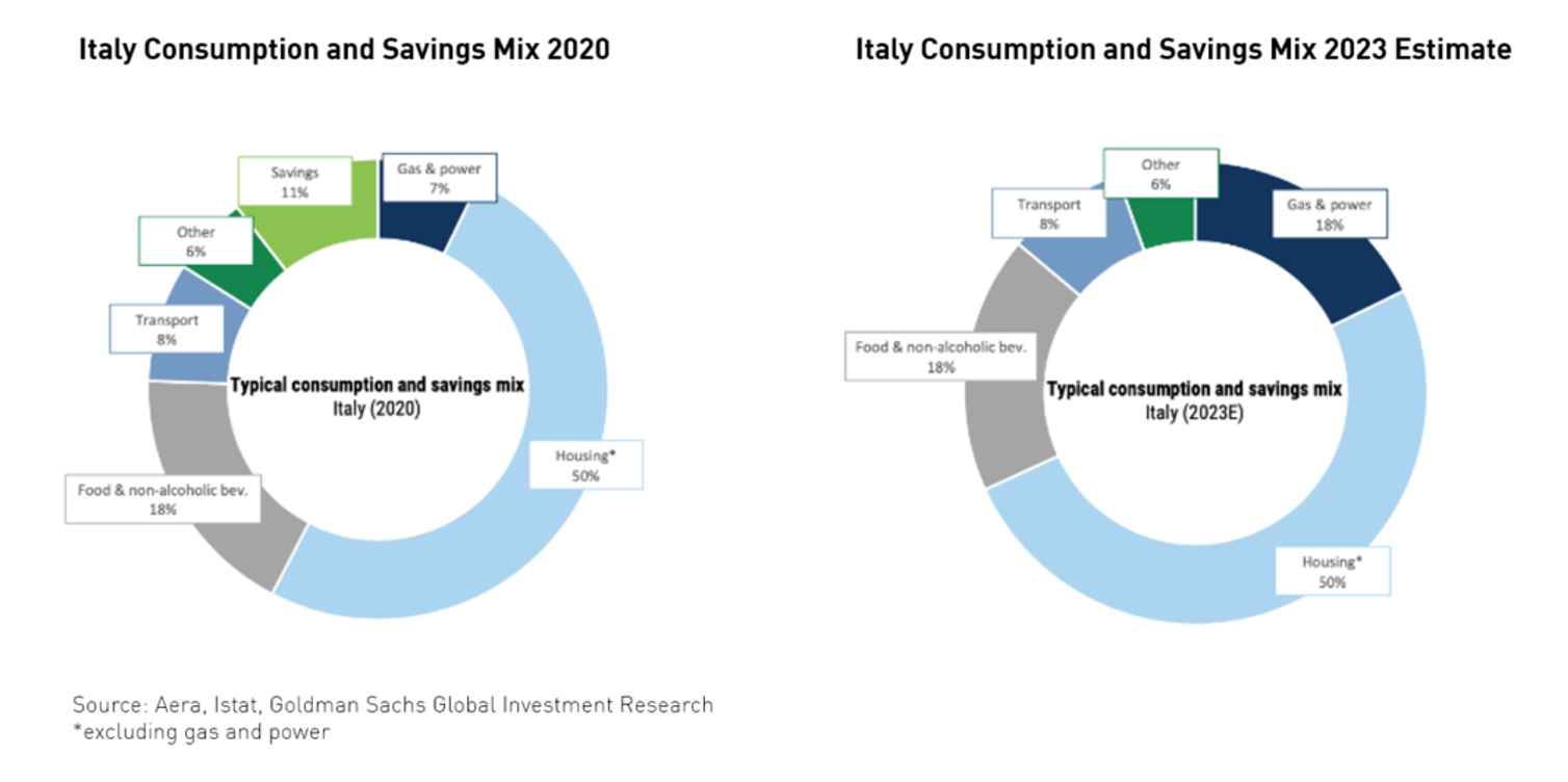 Per i consumatori, l’aumento dei prezzi dell’energia ha un impatto sostanziale sul potere di spesa. Una tipica famiglia italiana sta vedendo aumentare le sue bollette di gas ed elettricità di quasi 2.000 euro all’anno, o 165 euro al mese. Solo questo aumento è pari a più del 10% dello stipendio medio del paese, colpisce direttamente la capacità di consumo delle persone e crea una pressione significativa e immediata a livello politico.