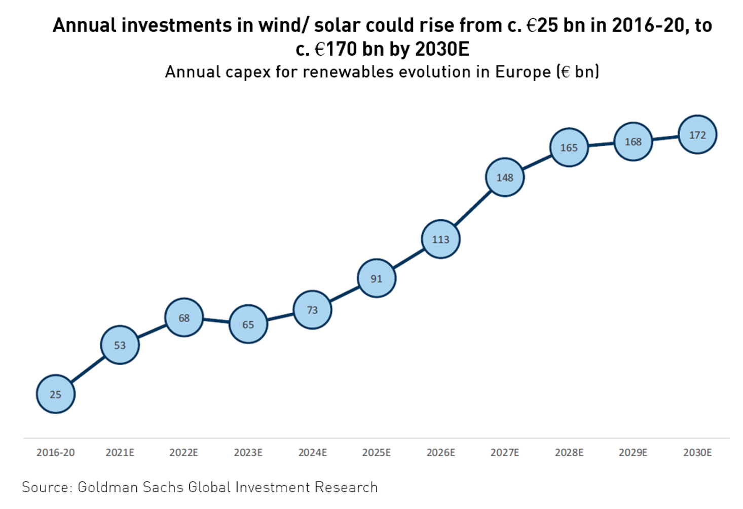 - Nuova capacità di generazione di energia rinnovabile – Goldman Sachs prevede un “super-ciclo di spese in conto capitale” nelle rinnovabili, con più di 1000 miliardi di euro spesi prima del 2030. Il piano prevede la costruzione di 480 GW di nuova capacità di generazione di energia eolica e 420 GW di energia solare in questo decennio, con permessi semplificati che permetteranno all’attività di iniziare ad accelerare dal 2024-25.