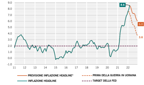 I prezzi del petrolio sono stati uno dei principali motori dell’aumento delle pressioni inflazionistiche, ma sono in calo dai massimi e questo movimento sta già mostrando i suoi effetti sull’inflazione headline. Se i prezzi del petrolio resteranno sui livelli attuali (intorno ai 107 dollari, da un picco di poco meno di 140 dollari), ciò avrà inevitabilmente un effetto disinflattivo sull’inflazione headline. Quindi, a meno che le sanzioni occidentali nei confronti della Russia non provochino un ulteriore calo delle forniture energetiche russe, i prezzi dell’energia non dovrebbero alimentare le pressioni inflazionistiche nei prossimi trimestri.
