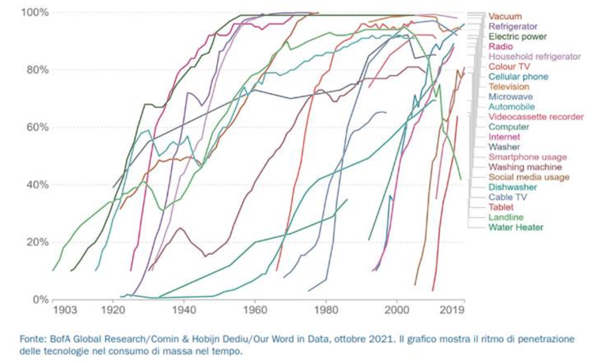 Figura 2: Il consumo tecnologico nelle auto e in altri settori si sta diffondendo ad un ritmo mai così elevato