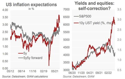 Eppure, come abbiamo sostenuto in passato, il rialzo dei rendimenti si sta ora scontrando con meccanismi di autocorrezione. Gran parte degli aumenti dei prezzi globali sono dovuti a questioni legate al lato dell’offerta che le banche centrali non possono controllare. La Fed, la BCE e le altre banche centrali devono ancora mostrare i denti per evitare che l’aumento delle aspettative di inflazione si trasformi in una spirale salari-prezzi e in un aumento dei prezzi persistente. Per i policy maker è ora rassicurante che gli swap sull’inflazione si siano appiattiti.
