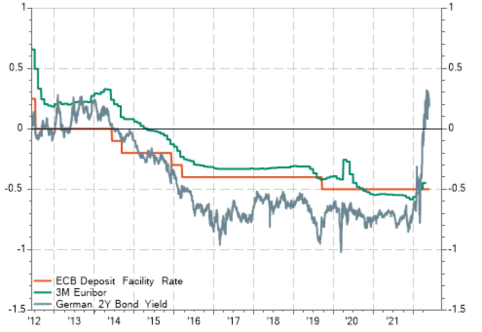 Il rendimento dell’obbligazione tedesca a 2 anni è tornato a livelli mai visti nell’ultimo decennio, poiché ha già prezzato una stretta della BCE piuttosto aggressiva.