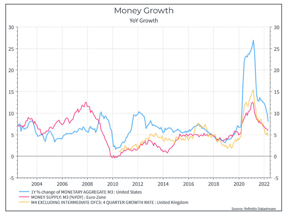 In primo luogo, cerchiamo di controllare il “Milton Friedman” che c’è in noi. Come si nota dal grafico qui sotto, la crescita dellamassa monetaria ha subito un’accelerazione durante la pandemia (vedi grafico sotto), ma dal 2021 mostra segnali di rallentamento.