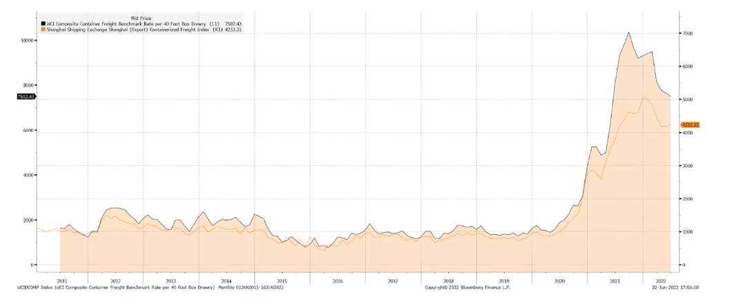 In secondo luogo, vediamo alcuni segnali di miglioramento delle catene di approvvigionamento. Il grafico sottostante mostra alcuni prezzi di riferimento per il trasporto di container. Sono ancora alti ma hanno iniziato a scendere.