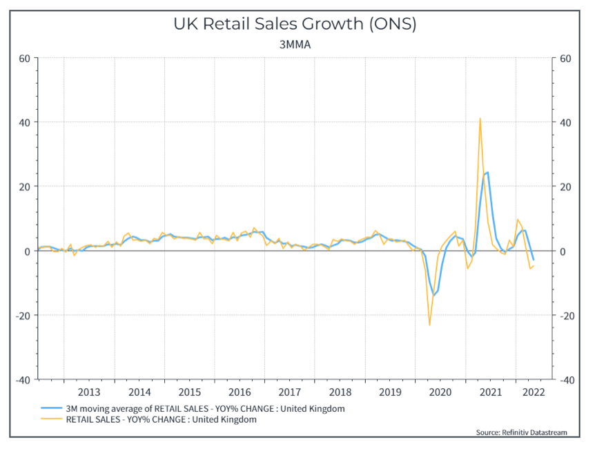 In terzo luogo, vediamo segnali di indebolimento della domanda. Nel Regno Unito, ad esempio, le vendite al dettaglio sono diminuite su base annua: