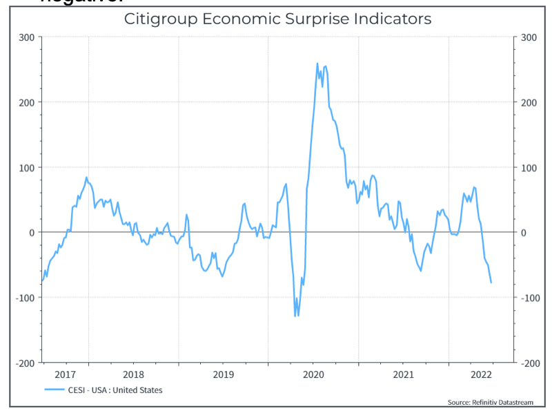 Negli Stati Uniti, l’indicatore Citigroup Economic Surprise (che confronta i risultati macroeconomici rispetto alle aspettative) è diventato negativo: