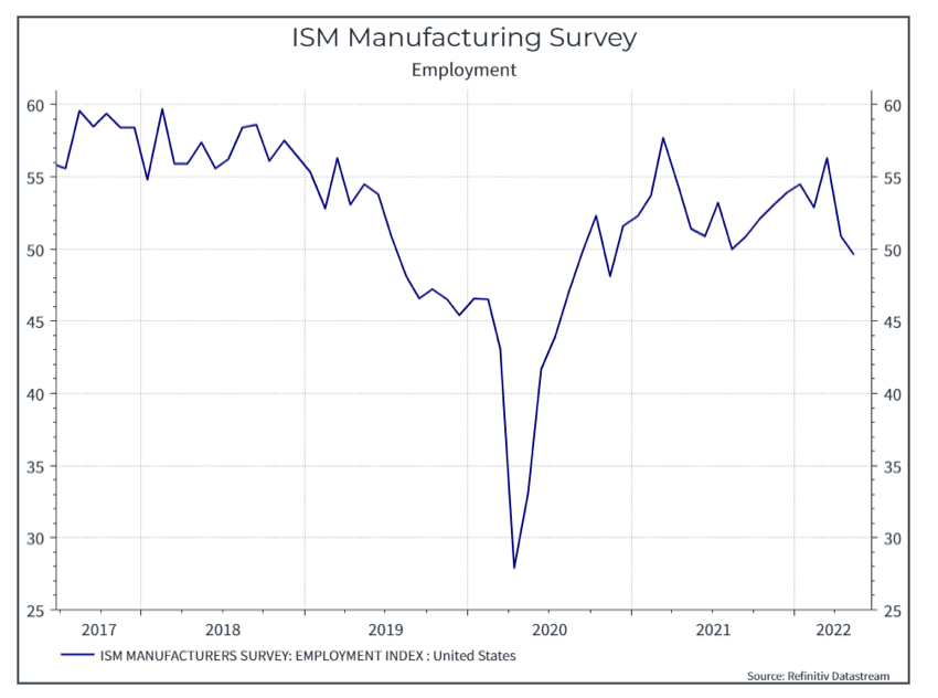 Nel complesso, l’occupazione nei mercati sviluppati rimane solida, ma la disoccupazione è generalmente un indicatore che sconta un certo ritardo. Tuttavia, l’indice di occupazione dell’indagine ISM Manufacturing ha iniziato a mostrare una certa debolezza: