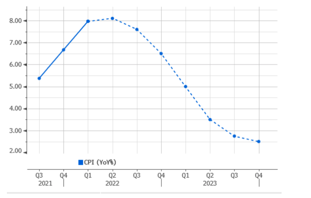 In ogni caso ci sono alcuni primi segnali più positivi: le domande chiave sono 1) se continueranno e 2) quanto rapidamente si tradurranno in un rallentamento dell’inflazione. Riteniamo che i dati macro continueranno ad attenuarsi, a fronte di una politica monetaria più restrittiva. Anche alla luce di tutti i rischi legati all’offerta (Ucraina, ecc.), ci aspettiamo di vedere un rallentamento dell’inflazione nei prossimi mesi. A onor del vero, questo è in linea con le attuali aspettative degli analisti (si veda il grafico sottostante sulle previsioni di inflazione negli Stati Uniti), ma considerando la frequenza con cui le stime di inflazione sono state riviste al rialzo, si potrebbe essere scettici su qualsiasi previsione di inflazione.