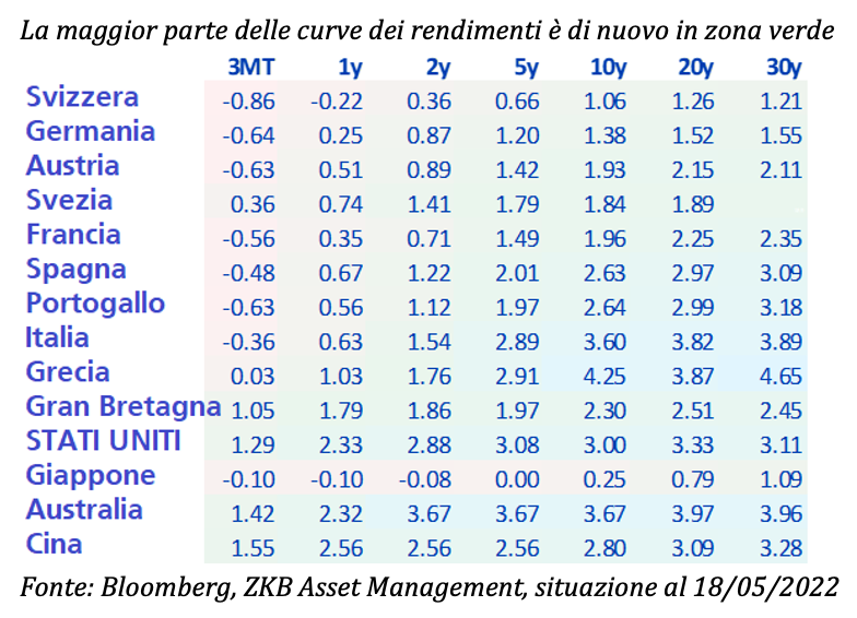 È possibile trovare ulteriori indicazioni osservando le ultime obbligazioni con rendimento negativo. La capitalizzazione di mercato di questi titoli, sebbene ancora al di sopra dei 2 mila miliardi di dollari statunitensi, è in deciso calo. Solo poche settimane fa, tra gli emittenti di titoli a rendimento negativo vi erano anche cinque Paesi europei, ma dopo gli ultimi importanti movimenti dei tassi d’interesse, resta solo il Giappone su scadenze oltre due anni.