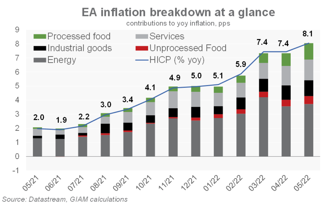 L’inflazione nell’area euro è balzata a maggio al nuovo massimo dell’8,1% anno su anno, quattro volte superiore all’obiettivo della BCE, e ci aspettiamo che si mantenga intorno a questi livelli nei prossimi mesi. Gli aumenti dei prezzi dell’energia e dei generi alimentari legati alla guerra hanno contribuito per oltre la metà a tale incremento. Ma anche la pressione inflazionistica di fondo rimarrà molto alta, ad esempio i prezzi alla produzione sono aumentati su base annua del 37,2% in aprile. Le preoccupazioni della BCE aumenteranno.