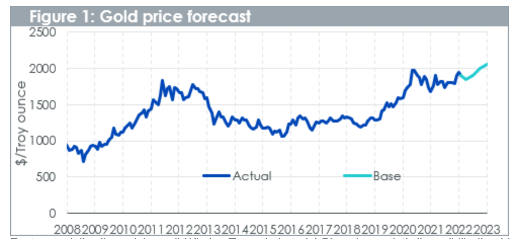 Rispetto a marzo 2022, il consensus di mercato ha modificato le proprie opinioni economiche, prendendo atto del ribasso dei bond e del rafforzamento del dollaro, e ha anche rivisto verso l’alto le previsioni sull’inflazione, riconoscendo la resistenza dei prezzi nonostante le misure aggressive delle banche centrali. L’aumento dei rendimenti obbligazionari e il rafforzamento del dollaro sono fattori negativi per il prezzo dell’oro, contrariamente all’aumento dell’inflazione. In base al nostro modello, entro il 1° trimestre del 2023 i prezzi dell’oro continueranno ad aumentare (cfr. la figura 1), ma non di quanto ci si attendeva in precedenza (circa 2.300 USD/oncia) ossia quando i venti contrari dovuti alle obbligazioni e al dollaro statunitense erano più lievi. Nella nostra previsione rivista ipotizziamo che, entro il 1° trimestre del 2023, i rendimenti delle obbligazioni decennali saliranno al 3,2% (contro il 2,80% attuale), il paniere denominato in dollari USA toccherà quota 105 (attualmente si trova a 102) e soltanto l’inflazione scenderà al 4,3% (rispetto all’8,3% dell’aprile 2022). Queste modifiche non alterano lo scenario ribassista né quello rialzista.