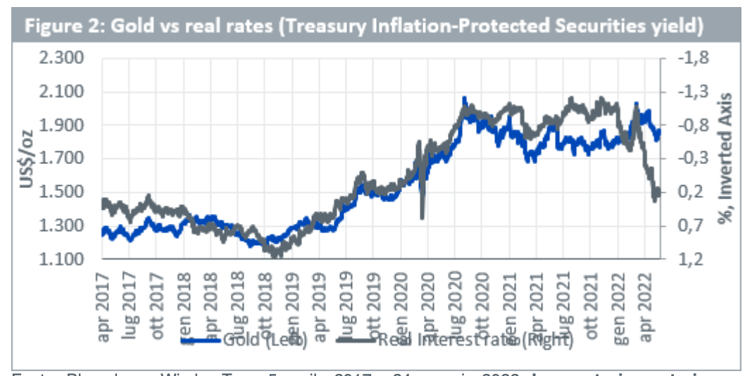 Abbiamo osservato che l’oro sta reggendo bene rispetto ai mercati obbligazionari, a dispetto della relazione tradizionalmente forte tra il suddetto metallo e i titoli di Stato protetti dall’inflazione (figura 2). L’oro è un asset che ottiene generalmente buoni risultati in condizioni finanziarie ed economiche sfavorevoli: con l’aumentare dei timori di una recessione, gli investitori stanno utilizzando sempre di più l’oro come copertura. Dall’inizio dell’anno fino al 24 maggio 2022 abbiamo riscontrato un afflusso globale di 7,3 milioni di once in exchange-traded commodity (ETC) sull’oro (contro un deflusso netto di 9,2 milioni di once registrato in tutto il 2021).