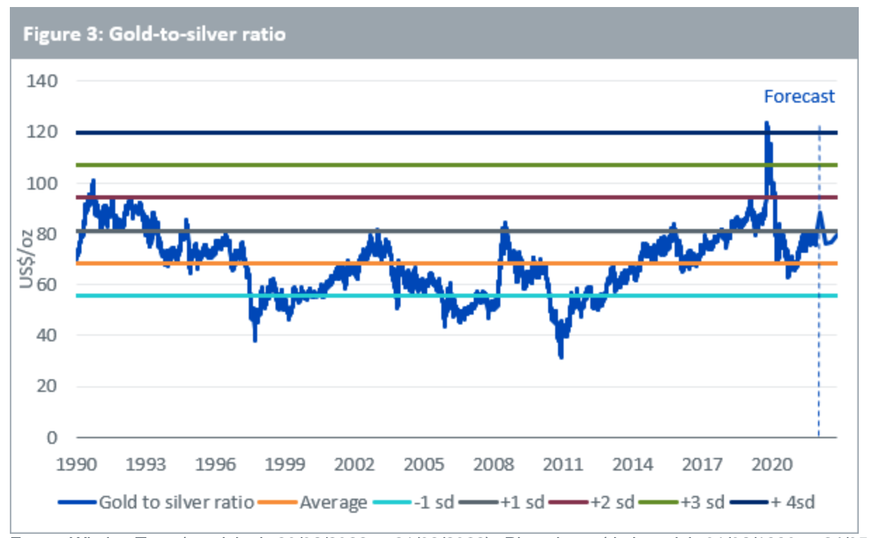 Le nostre previsioni per l’argento indicano che il rapporto oro/argento (figura 3), attualmente elevato, potrebbe scendere un po’.