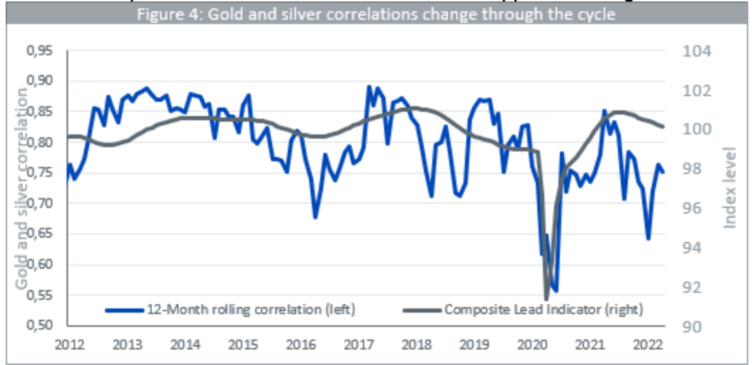 Secondo il nostro modello sull’argento, la sensibilità di quest’ultimo ai prezzi dell’oro sarà ampiamente stabile per tutto il ciclo economico, ma in realtà la correlazione tra i due metalli è fluttuante (figura 4). Crediamo che, nel caso in cui la recessione diventi il motore principale per il prezzo dell’oro, l’attività manifatturiera possa contrarsi, esercitando una pressione negativa sull’argento, mentre i prezzi dell’oro continueranno a salire. Ciò potrebbe far crescere ulteriormente il rapporto oro/argento.