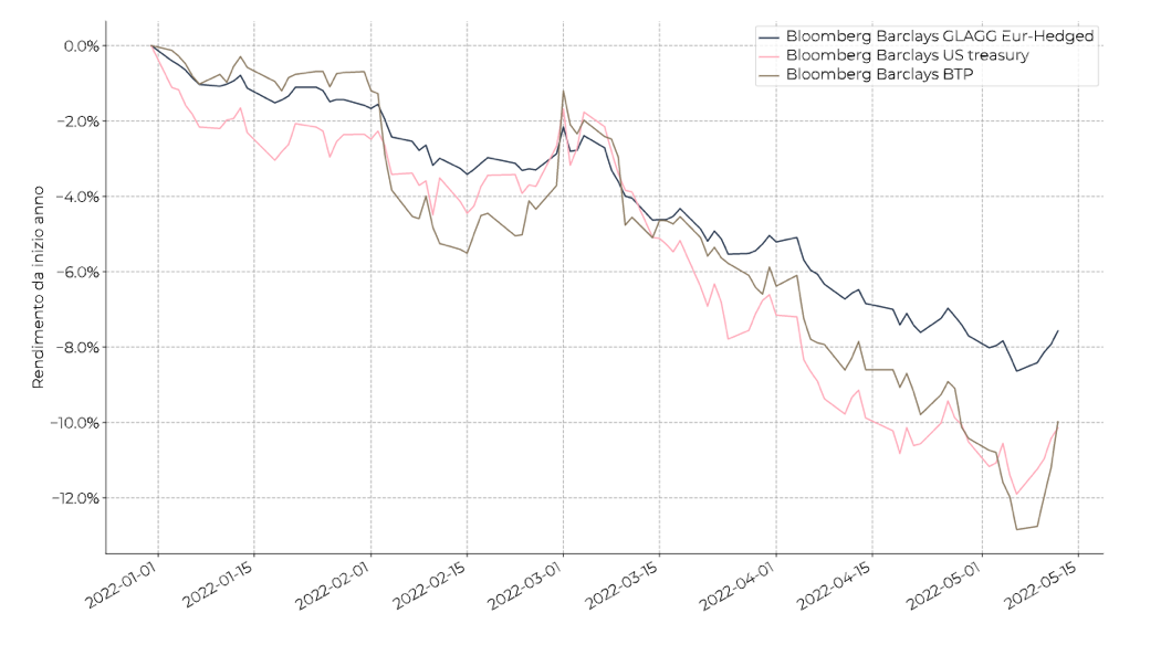 Da inizio anno le performance registrate su tutti i maggiori indici sono state negative. L’indice obbligazionario globale, come si può notare nel grafico sottostante, ha fatto registrare un -8% da inizio anno a maggio 2022. Le performance sono state in territorio negativo fin dai primissimi mesi dell’anno; a gennaio si è segnato un -1,4% e nel mese successivo si è arrivati ad un -1,9%. La risalita dei tassi d’interesse – legata principalmente a inflazione e politica monetaria – non ha lasciato scampo agli investitori in obbligazioni, la cui performance è caratterizzata da un costante declino ormai da diversi mesi.