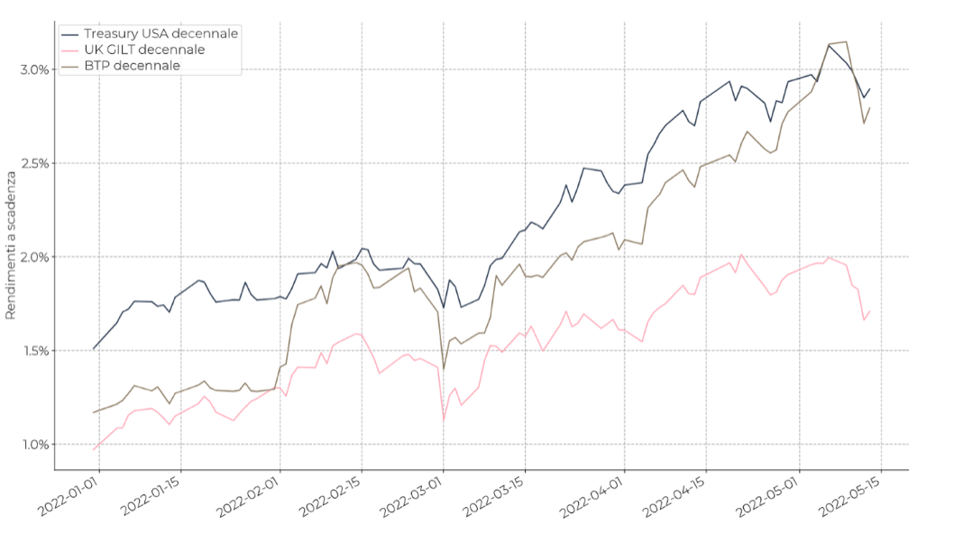 Nel grafico seguente possiamo invece osservare come si sono mossi i tassi d’interesse sui titoli di stato tra i più rilevanti a livello globale: i BTP italiani, i Gilt del Regno Unito e i Treasury statunitensi. Per quelli italiani con durata medio/lunga il rendimento a scadenza è passato da 1,3% di inizio anno a circa il 3% di metà maggio. Essendo i prezzi inversamente proporzionali ai rendimenti, il decennale italiano si è dunque deprezzato fino ad un massimo del 15%.