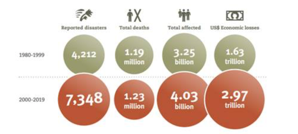 Impatti delle catastrofi naturali comparati tra il periodo 1980-1999 e 2000-2019.