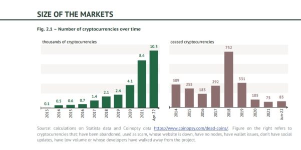 Fra gli argomenti principali affrontati dal rapporto, oltre alla dimensione dei mercati, il numero di criptovalute (nel tempo), l’evoluzione della capitalizzazione delle criptovalute, del mercato azionario e di altre attività.
