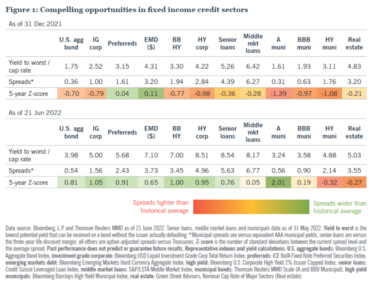 Credito liquido anziché azioni: L’ingresso dei titoli azionari nella fase di mercato orso porta a chiedersi se il ribasso abbia creato un vero valore o semplicemente una trappola del valore. L’indice S&P 500 attualmente scambia a un rapporto P/E prospettico di 15,7x, in calo dell’8% circa rispetto alla media decennale del 17,1x. Ma questo multiplo non indica alcuna possibile revisione degli utili in negativo per la seconda metà dell’anno. Alla luce di ciò, preferiamo accedere a un’esposizione risk-on attraverso i settori del credito a reddito fisso pubblici, che riteniamo offrano nel breve termine prospettive di rendimento per unità più interessanti del potenziale rischio di ribasso (grafico 1).