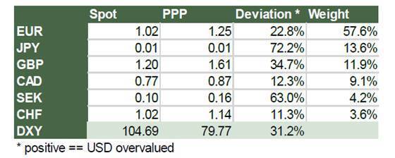 La questione di fondo è stabilire se l’euro si è deprezzato o se il dollaro è troppo caro. Abbiamo replicato l’esercizio della parità del potere d’acquisto per le valute DXY. Il DXY è un indice molto diffuso che ricostruisce il tasso di cambio del dollaro rispetto alle sei principali valute (ciascuna ponderata per la propria importanza). Il risultato è chiaro: