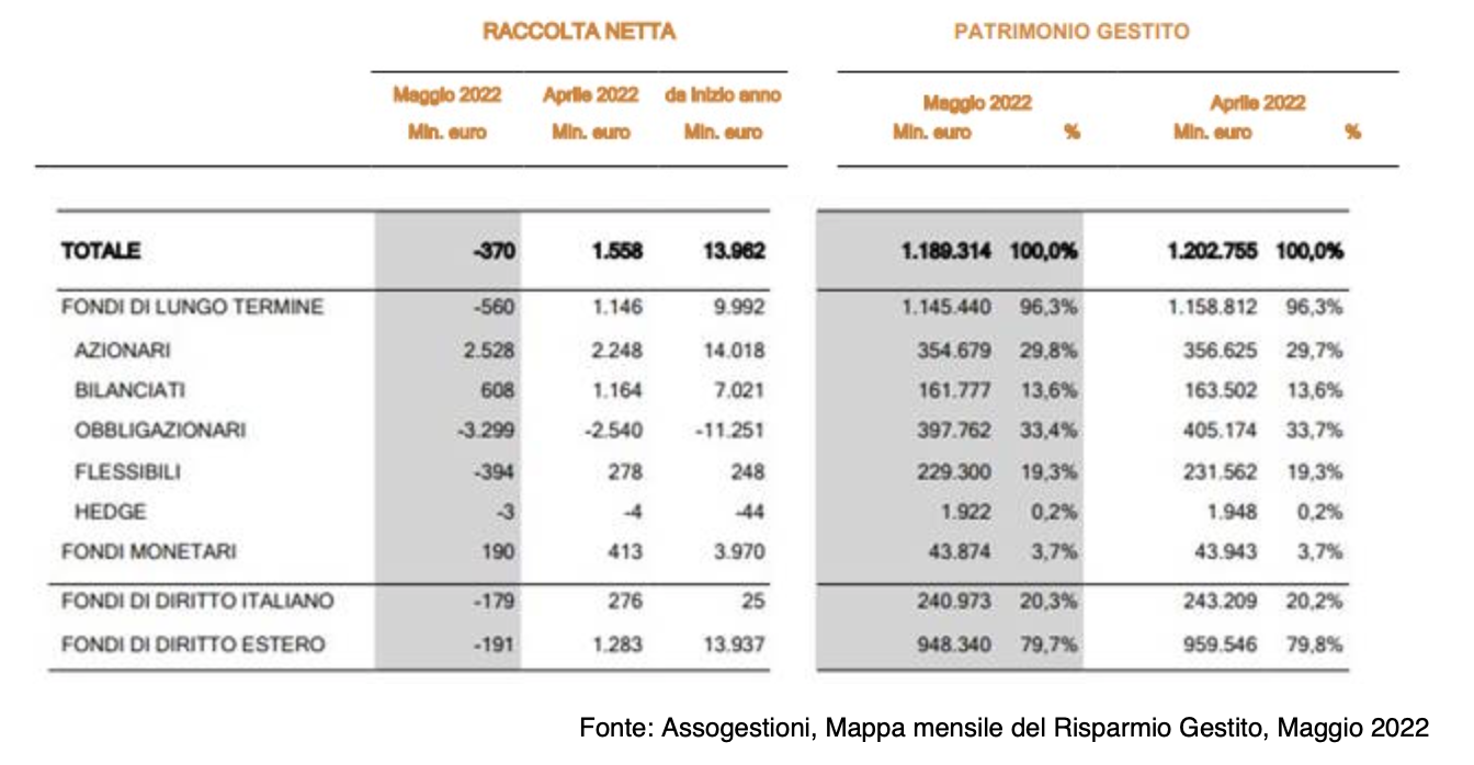 La volatilità dei mercati non sembra rappresentare un ostacolo per quanti sono interessati a investire in fondi azionari, come dimostra l’ultima Mappa mensile di Assogestioni relativa a maggio 2022 (Fig.1). In questo particolare momento di mercato stiamo osservando una riallocazione degli investimenti dal reddito fisso all’equity, complici anche il recente rialzo dei tassi e le prospettive di un’inflazione duratura, che fanno venire meno l’appeal delle asset class obbligazionarie.