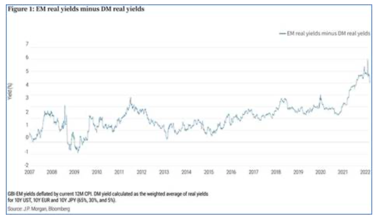 L’attuale shock inflazionistico è un fenomeno globale, determinato dalle interruzioni della catena di approvvigionamento e dall’impatto della guerra tra Russia e Ucraina sui prezzi dei prodotti alimentari e delle materie prime, con conseguenze per le nazioni di tutto il mondo. La risposta delle autorità è variata da Paese a Paese, contribuendo a creare elevati differenziali tra i tassi di interesse reali – o corretti per l’inflazione – nei mercati sviluppati e nei mercati emergenti. Riteniamo che ciò possa offrire agli investitori opportunità di rendimenti decorrelate sotto forma di debito locale dei mercati emergenti. Tuttavia, gli investitori devono essere.