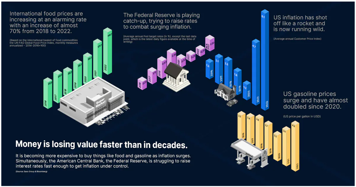 Ma quando ci si informa sull’andamento dei mercati finanziari si può verificare facilmente che le cose non vanno così bene. Malgrado ciò, abbiamo chiesto al nostro Head of Equity Strategy, Peter Garnry, e al nostro Head of Commodities, Ole Hansen, dove si può cercare di intervenire per combattere l’inflazione, senza rimanere vittima del calo dei mercati. Ci hanno evidenziato tre idee che potrebbero tornarci utile in questa fase.