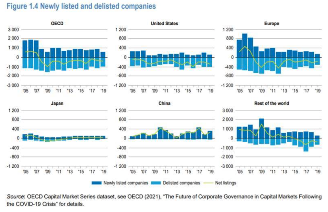 Uno studio dell’Ocse pubblicato a metà 2021 ha registrato circa 30 mila delisting a livello globale tra il 2005 e il 2020. Anche se complessivamente la capitalizzazione di mercato è aumentata da 84 a 105 mila miliardi di dollari tra il 2017 e il 2020, nei paesi membri Ocse c’è stata una perdita netta di società quotate in ogni singolo anno dal 2008, con il numero complessivo di quotate sceso da 41 mila a 40 mila. Mentre le società già quotate raccolgono sempre più nuovi capitali in borsa, il volume delle Ipo è diminuito, soprattutto in Europa, e nell’ultimo decennio è stato solo la metà di quello degli anni ’90. A Piazza Affari, sebbene nel periodo 2002-21 il saldo tra nuove quotazioni (448) e delisting (336) sia positivo, i ben 105 delisting registrati negli ultimi cinque anni hanno provocato una perdita di capitalizzazione di oltre 55 miliardi di euro.