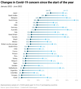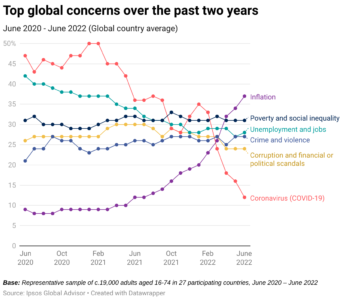 Il 37% delle persone in 27 Paesi del mondo ha citato l’inflazione come uno dei principali problemi che il loro Paese deve affrontare oggi. Si tratta di un aumento di 3 punti percentuali rispetto a maggio. La crescente preoccupazione per l’inflazione arriva durante una visibile crisi globale del costo della vita in molte economie del mondo.