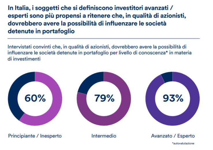 La ricerca mostra infatti che in Italia il 93% dei soggetti che si definiscono investitori “avanzati/esperti” ritiene che il ruolo di azionisti dovrebbe conferire loro la possibilità di influenzare le società detenute in portafoglio (95% a livello globale), contro il 60% (69% il dato globale) degli investitori “principianti/inesperti”.