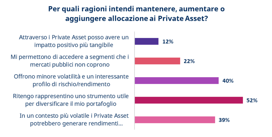 I dati evidenziano inoltre che ben il 57% degli investitori italiani investe già o intende investire in futuro nei mercati privati. Tra le motivazioni che stanno alla base di tale inclinazione, il 52% degli investitori sottolinea il ruolo di diversificazione di tali strumenti, il 40% indica la minore volatilità e un profilo rischio/rendimento interessante, mentre il 39% evidenzia la capacità dei mercati privati di generare rendimenti attraenti e decorrelati nell’attuale contesto macroeconomico.