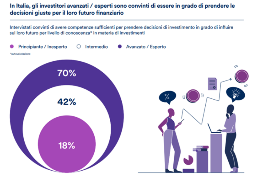 Il divario esistente tra investitori con competenze finanziarie diverse è confermato anche dal dato relativo alla percezione della propria capacità di prendere le giuste decisioni di investimento per il proprio futuro. Il 70% degli investitori “avanzati/esperti” italiani (82% il dato globale) ritiene di avere conoscenze sufficienti per prendere decisioni di investimento per il proprio futuro finanziario, mentre solo il 18% degli investitori “principianti/inesperti” (26% il dato globale) si sente abbastanza informato per farlo. Ciò evidenzia la necessità di una migliore educazione finanziaria, soprattutto nel nostro Paese, e il ruolo attivo che i fornitori di servizi finanziari devono svolgere.