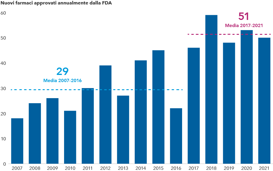 I periodi di accelerazione dell’innovazione possono creare opportunità per investimenti a lungo termine proficui. L’innovazione ha spesso favorito gli utili e i rendimenti degli investimenti per molti anni. Inoltre, molte grandi società farmaceutiche sono ben capitalizzate e dispongono di molta liquidità in bilancio, il che offre loro l’opportunità di finanziare la propria crescita attraverso acquisizioni e altre strategie.