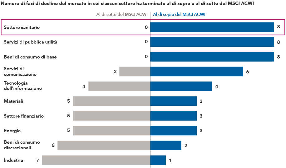 Fonti: Capital Group, FactSet, MSCI. Include i rendimenti totali dei settori del MSCI ACWI degli ultimi otto periodi durante i quali l’S&P 500 ha subito un calo di oltre il 15% in termini di rendimento totale. Il mercato ribassista del 2022 viene considerato attuale al 30 giugno 2022 ed è incluso in questa analisi. I periodi inclusi nell’analisi di cui sopra sono: 17 luglio 1998 – 31 agosto 1998; 24 marzo 2000 – 9 ottobre 2002; 9 ottobre 2007 – 9 marzo 2009; 23 aprile 2010 – 2 luglio 2010; 29 aprile 2011 – 3 ottobre 2011; 3 ottobre 2018 – 24 dicembre 2018; 19 febbraio 2020 – 23 marzo 2020 e 3 gennaio 2022 – 30 giugno 2022.