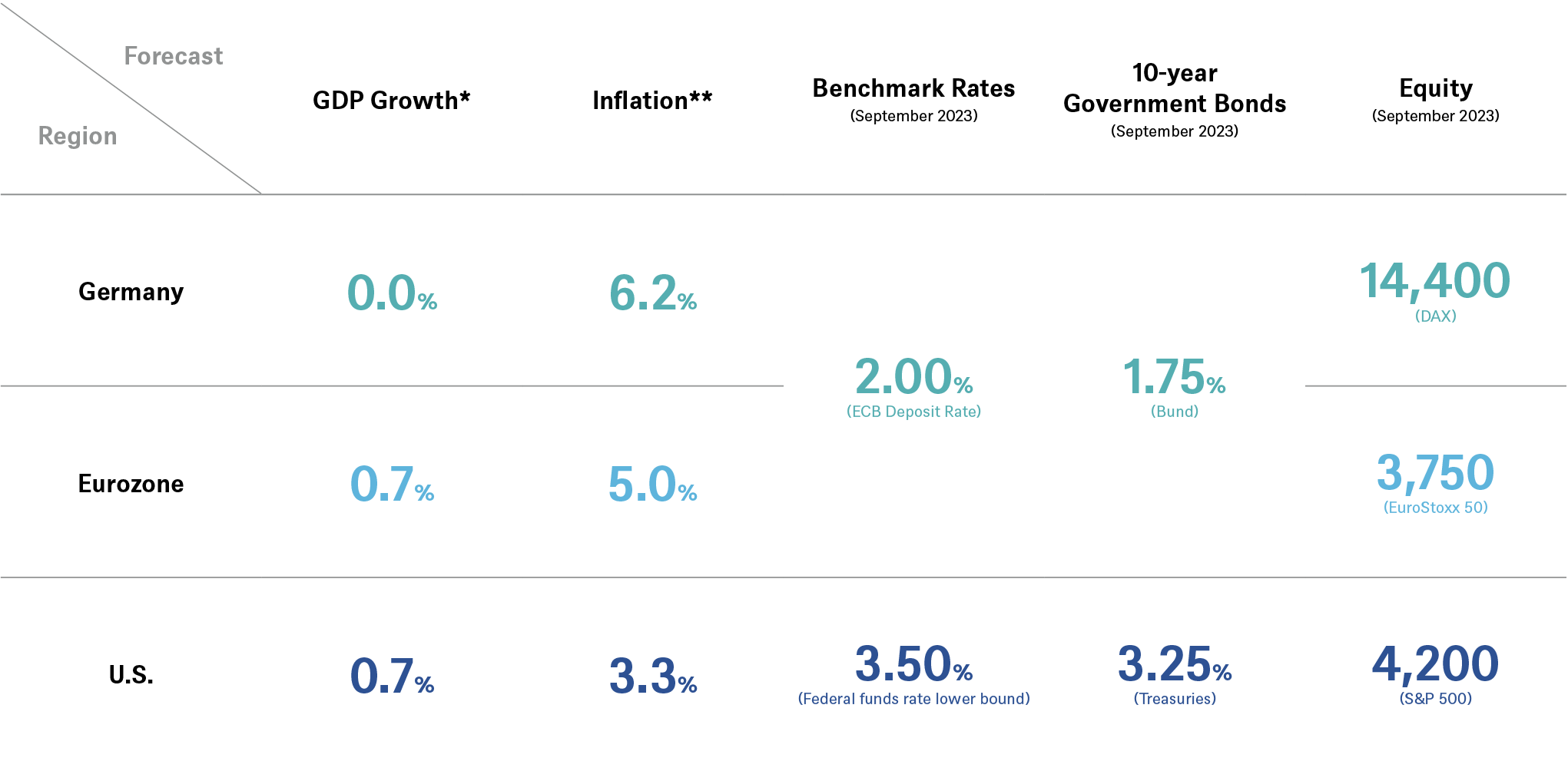 Nelle nostre nuove previsioni a 12 mesi, ipotizziamo che le banche centrali continueranno a inasprire le misure in modo più aggressivo di quanto previsto da molti operatori di mercato, soprattutto in Europa. Alcune delle principali implicazioni di questa nuova previsione sono illustrate nella tabella qui sotto. In poche parole, temiamo che, al netto dell’inflazione, la crescita economica reale continuerà ad arrestarsi, mentre l’inflazione sembra destinata a rimanere ostinatamente ben al di sopra del 2%, il livello che le banche centrali dovrebbero raggiungere. Sia la Fed che la Banca Centrale Europea (BCE) sembrano estremamente desiderose di ripristinare la propria credibilità e di mantenere un freno alle aspettative di inflazione, anche a costo di una recessione economica. Ciò rafforza l’atteggiamento prudente che abbiamo assunto nei confronti dei titoli di Stato dalla fine dello scorso anno. Ciò rende difficili le prospettive per i prodotti a reddito fisso, almeno nel breve periodo. In un contesto caratterizzato da un numero crescente di rischi geopolitici, le materie prime, compresi i metalli preziosi come l’oro, appaiono interessanti soprattutto come diversificatori di portafoglio, piuttosto che in termini di potenziale assoluto.