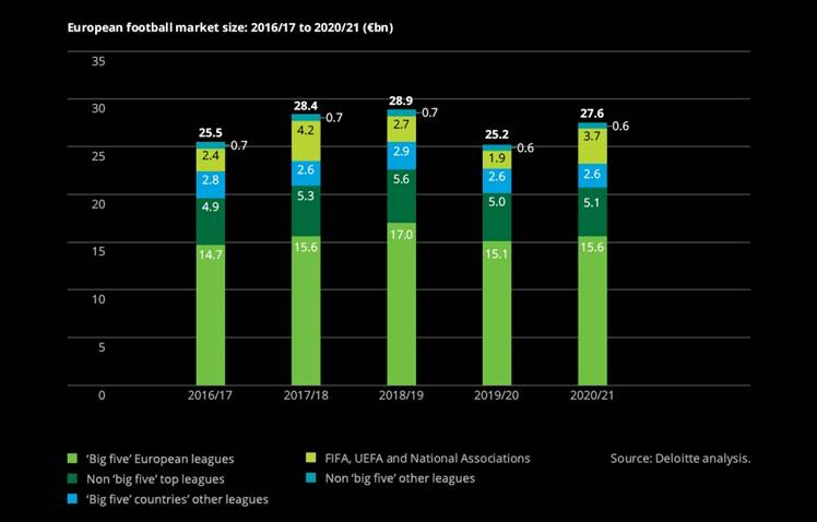 Nonostante ciò, il mercato calcistico europeo è cresciuto in maniera decisa in termini di ricavi del 10%, raggiungendo i 27,6 miliardi di euro, grazie al torneo UEFA EURO 2020 e ai ricavi differiti della stagione 2019/20, la prima colpita dal lockdown imposto dalla pandemia. Questo dato indica una ripresa significativa in termini di ricavi, con il ritorno ai livelli pre-COVID previsto per la stagione 2021/22.