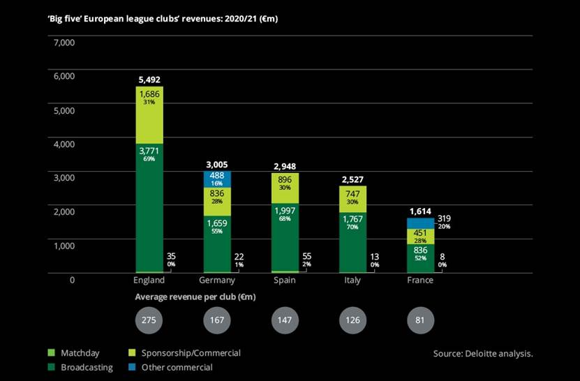 Le prospettive per i cinque grandi campionati europei sono più rosee: in questa stagione i club riaccoglieranno i tifosi negli stadi, il nuovo ciclo dei diritti televisivi UEFA per il periodo 2021/22-2023/24 garantisce un aumento dei ricavi ai club partecipanti e i nuovi accordi televisivi porteranno un aumento ai club di alcuni campionati. I ricavi aggregati previsti nella stagione 2022/23 dei “cinque grandi” campionati toccheranno la quota record di 18,6 miliardi di euro. La Premier League estenderà il suo vantaggio in termini di ricavi rispetto alle altre leghe, mentre sia la Serie A che la Ligue 1 produrranno probabilmente introiti ancora inferiori ai livelli del 2018/19.