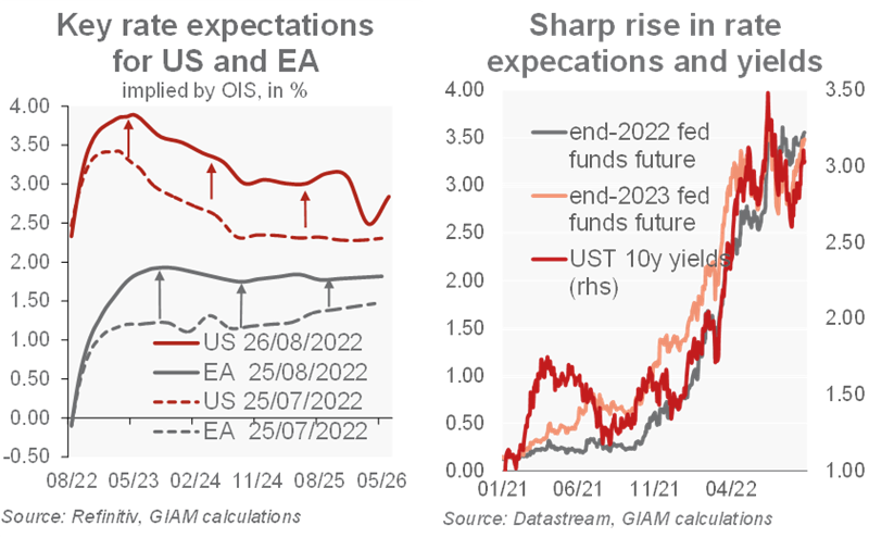 La differenza che un solo anno può fare: alla riunione di Jackson Hole del 2021, il presidente della Fed Powell si era impegnato a perseguire la massima occupazione, liquidando l’inflazione come transitoria. Quest’anno, i banchieri centrali hanno indicato l’impegno incondizionato a domare l’inflazione e si sono preparati ad un dolore incombente in questa lotta. Le pressioni sui prezzi persistono tra l’aumento dei salari negli Stati Uniti e l’incremento dei costi energetici in Europa. Gli anni ’70 insegnano che le banche centrali devono agire tempestivamente e con forza per evitare che le crescenti aspettative di inflazione perpetuino la pressione sui prezzi. Quindi, anche tra i crescenti rischi di recessione, Powell ha preparato gli americani a “un certo dolore” (ovvero economia più debole e meno posti di lavoro), mentre Schnabel della BCE ha previsto un “sacrificio” più ampio per domare le pressioni sui prezzi rispetto ai precedenti periodi di inasprimento. Guardando a settembre, ciò implica che rialzi di 50 punti base sembrano essere il minimo sia per la BCE (8 settembre) che per la Fed (21 settembre), con addirittura uno scenario di 75 punti base da prendere in considerazione.