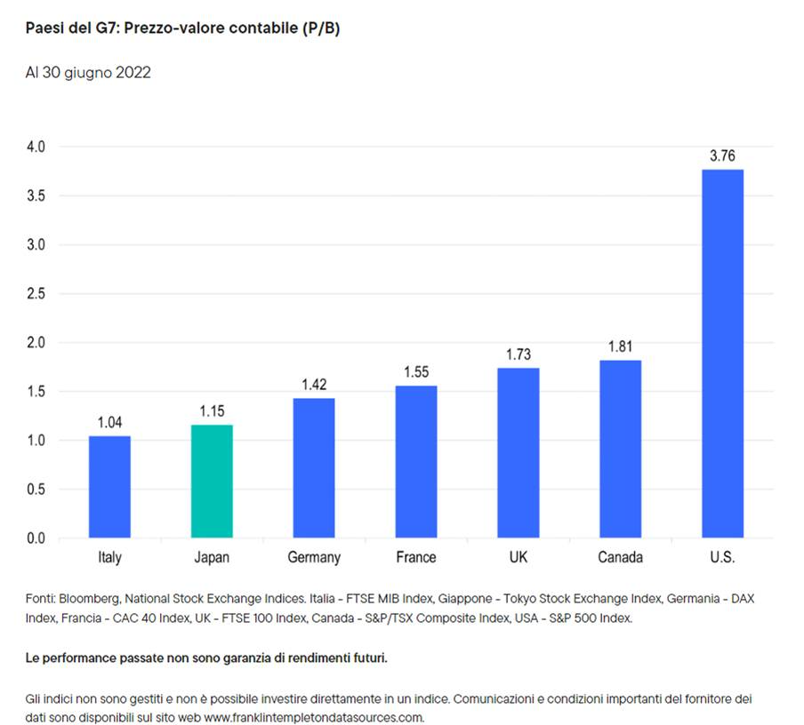 Nella nostra analisi, le valutazioni attuali delle azioni giapponesi sono interessanti rispetto a quelle di altri mercati sviluppati. In base a un rapporto prezzo-valore contabile, il Tokyo Stock Exchange Index sta scambiando ad appena meno del valore contabile 1,2x, per cui si può dedurre che le valutazioni delle azioni rappresentate sono migliori rispetto ad altri paesi membri del G7.