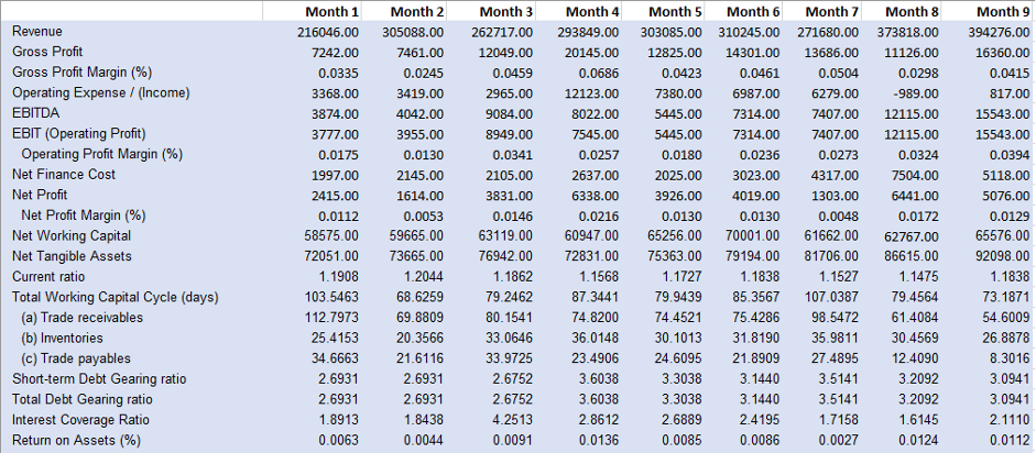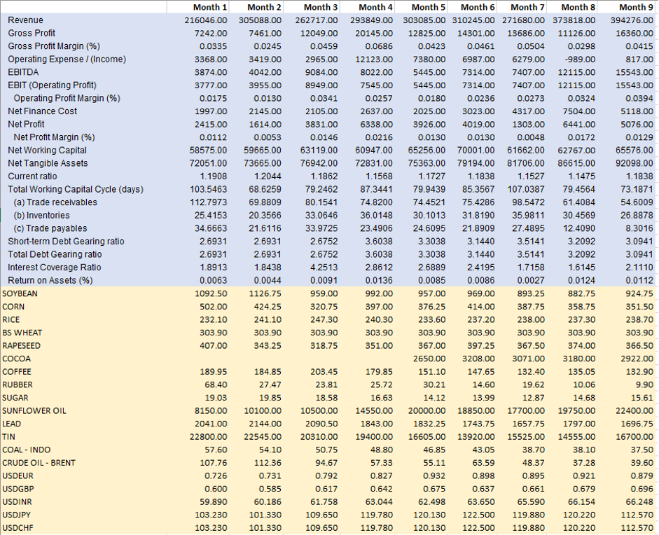 Illustriamo ora, con un esempio molto semplice, l’importanza di un approccio sistemico analizzando una società di trading di materie prime. Cominciamo con un approccio convenzionale e guardiamo ad alcuni dati mensili, tipo fattirato, EBIT, ecc. I dati sono riportati di seguito.
