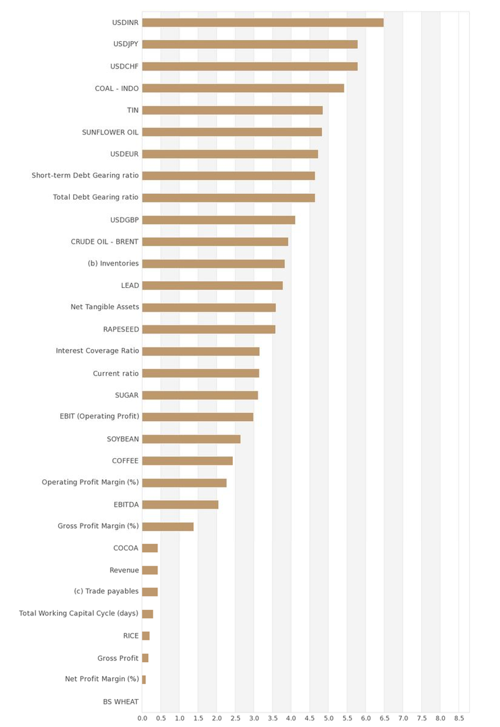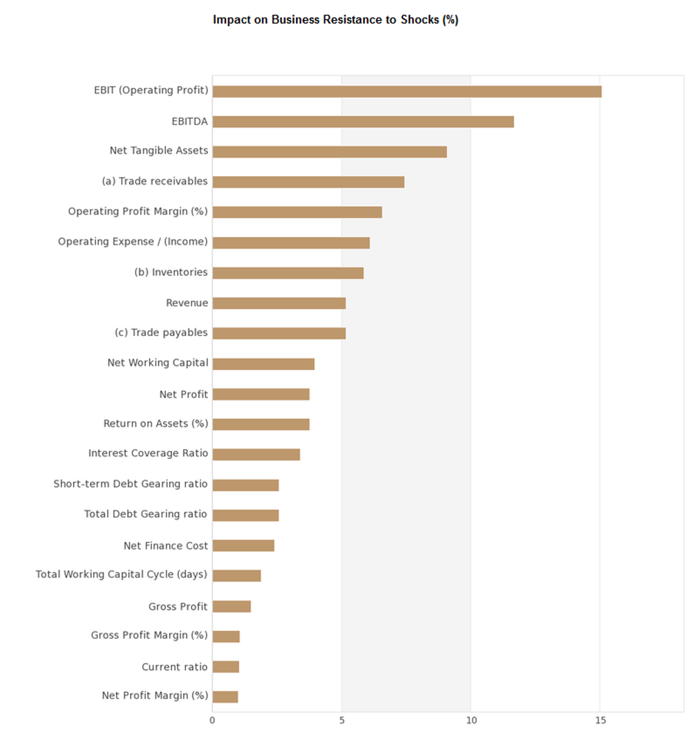 Questo risultato mostra come oltre il 50% della resilienza dell’azienda – ossia’ l’esposizione al rischio – sia guidata da variabili esterne, ovvero variabili che non sono sotto il controllo dell’azienda (o di chiunque altro!). In effetti, i tassi di cambio USD contro JPY, INR e CHF da soli guidano oltre il 17% della resilienza del business. Se una di queste valute dovesse subire un’crollo o aumento repentino, ciò influirebbe in modo significativo sull’attività.