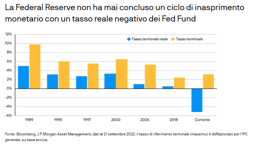 L’attività aggressiva delle Banche Centrali ha spinto al rialzo i rendimenti a breve termine su scala globale. Per i titoli di Stato biennali di Regno Unito e Germania l’aumento è stato consistente, rispettivamente di 269 e 236 pb da inizio anno. Negli Stati Uniti i rendimenti sono saliti anche di più: quello dei Treasury a due anni ha raggiunto il 4,05% (+328 pb), un livello che non si vedeva dal 2007. Nonostante l’entità di questi aumenti, i rendimenti a breve termine tendono a salire ulteriormente visto che le Banche Centrali sembrano volersi concentrare solo sulla lotta all’inflazione intervenendo in modo più aggressivo sul costo del denaro. Inoltre, se si esamina la storia della Fed, non è mai accaduto che l’Istituto abbia concluso il suo ciclo di inasprimento con un tasso reale dei Fed Fund in territorio negativo. Anche dopo l’ultimo rialzo, il tasso reale dei Fed Fund è ancora in profondo rosso, al -5%, segno che le misure di inasprimento non si fermeranno. Sembra che il Federal Open Market Committee sia d’accordo: le revisioni del dot plot hanno innalzato le aspettative sul tasso medio d’interesse al 4,375% (100 pb in più) nel 2022 e al 4,625% (75 pb in più) nel 2023. Dati al 21 settembre 2022.