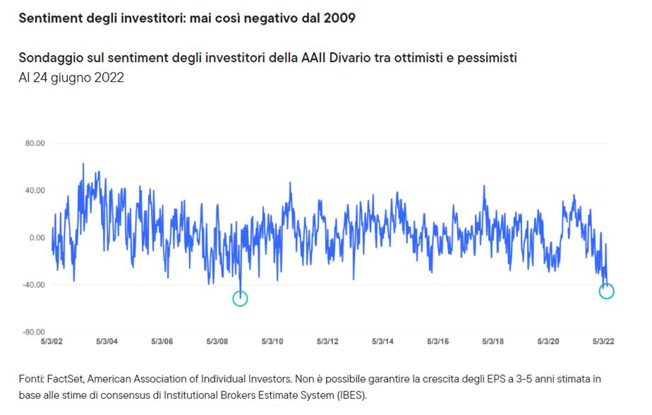 I mercati globali sono a un bivio: da un lato grandi timori legati a inflazione, tassi di interesse e flessione della crescita, dall’altro enorme incertezza sul fronte geopolitico europeo a causa della guerra fra Russia e Ucraina e delle sue possibili conseguenze. Il clima di mercato naturalmente ne risente e gli investitori sono passati dal grande di ottimismo del 2021 al pessimismo estremo delle ultime settimane. Gli indicatori del sentiment sono prossimi ai minimi del 2009. Livelli simili danno da pensare considerando che lo stato dell’economia oggi è sicuramente migliore che nel 2009, quando l’economia USA era alle prese con forti squilibri finanziari e con l’implosione del mercato residenziale.